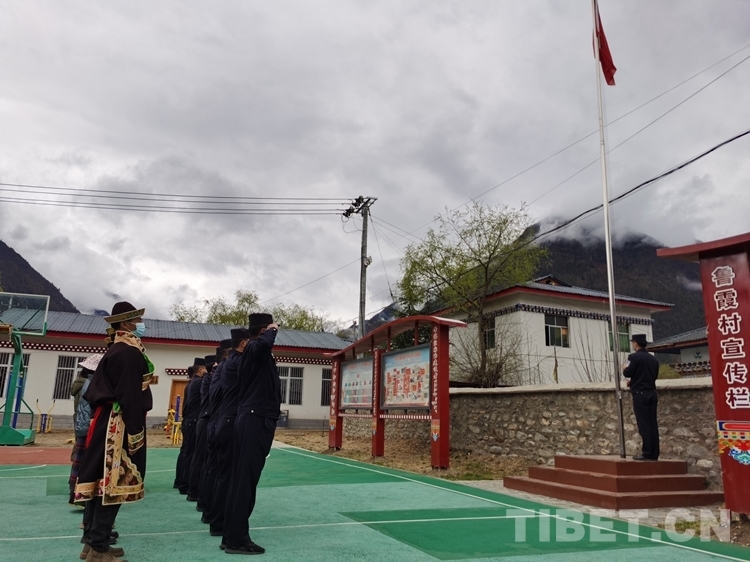 圖為西藏林芝魯霞邊境派出所在魯霞村與群眾舉行升旗儀式 攝影:唐灝洋