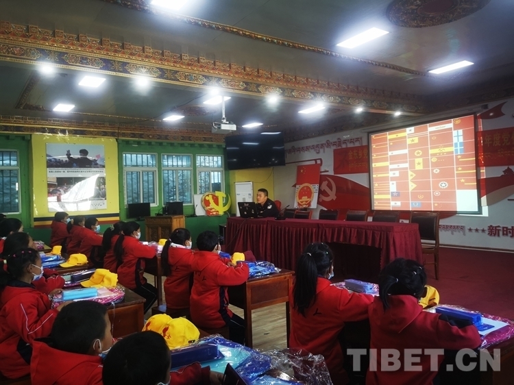 當(dāng)天,西藏林芝金東邊境派出所民警李青昀早早地起床,又認(rèn)真熟悉了一遍課件內(nèi)容,帶著電腦來(lái)到了朗縣國(guó)門講習(xí)所,他要為當(dāng)?shù)匦W(xué)生帶來(lái)愛(ài)國(guó)主義小課堂。