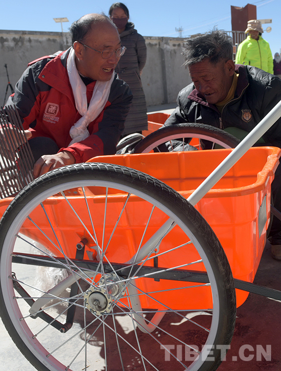 這是唐召明(左)在雙湖縣嘎措鄉(xiāng)一村指導(dǎo)他30多年前的房東、藏族牧民朋友日瑪(右)安裝北京建藏援藏工作者協(xié)會(huì)贈(zèng)送的高原撿拾車(chē)(楊月云2019年9月20日攝)