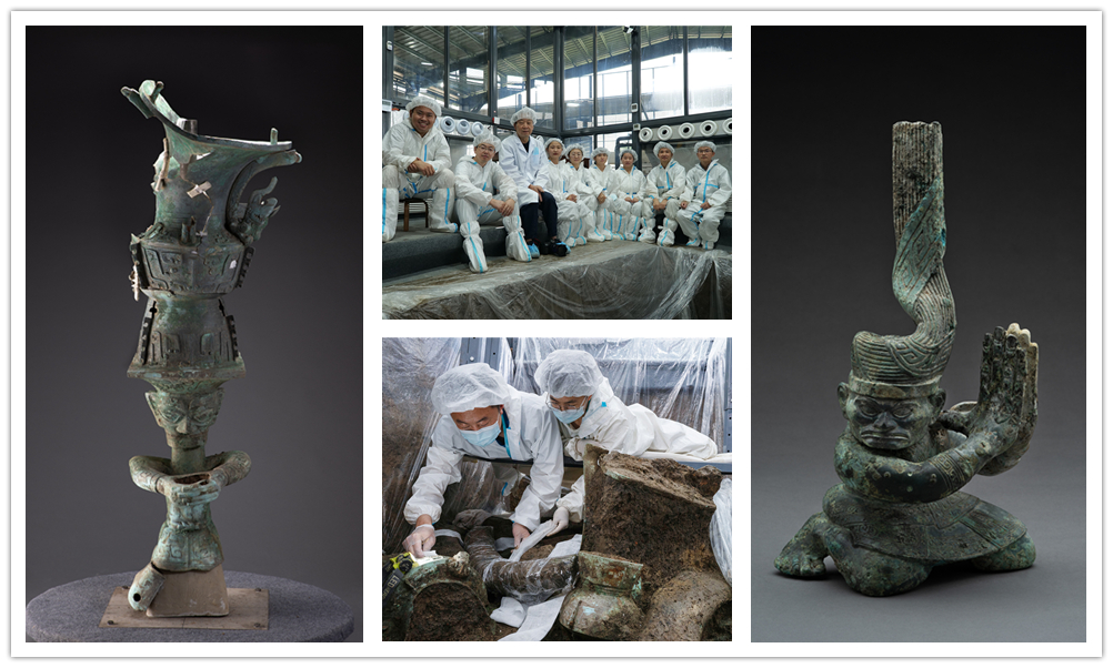 圖左為三星堆遺址三號(hào)坑出土銅頂尊跪坐人像;圖中上為部分發(fā)掘人員合影;圖中下為象牙保護(hù)與提取;圖右為三星堆遺址四號(hào)坑出土扭頭跪坐銅人像 圖片來(lái)源:國(guó)家文物局