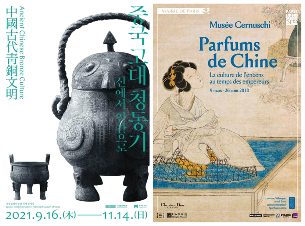 圖左為2021年9月,上海博物館在韓國(guó)國(guó)立中央博物館舉辦“中國(guó)古代青銅文明”特展海報(bào);圖右為2018年上海博物館在法國(guó)巴黎舉辦的“中國(guó)芳香:古代中國(guó)的香文化”展覽海報(bào) 圖片來(lái)源:上海博物館
