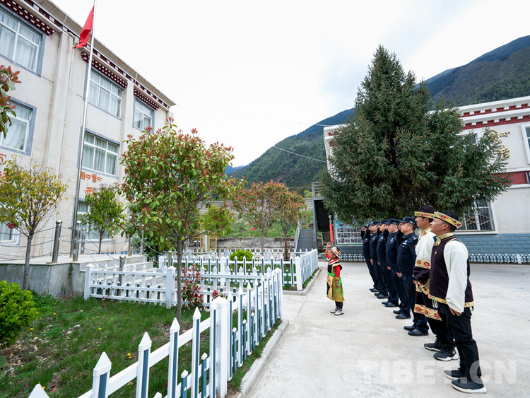 來自派鎮(zhèn)雪卡村的5歲小女孩旦增玉珍在林芝邊境管理支隊派邊境派出所,與移民管理警察共同參加升旗儀式。還在上幼兒園的她,像學(xué)校里的哥哥姐姐們一樣,一邊敬禮一邊唱國歌,同派出所民警一起接受愛國主義熏陶。