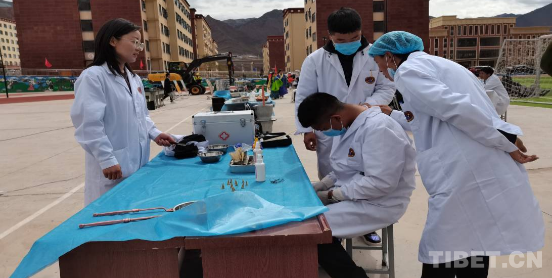 藏醫(yī)藏藥專業(yè)的同學們在老師的指導下,有條不紊地進行著火灸,三兩個同學一起配合,在“患者”頸部選定穴位,點火,看火,直至火焰熄滅,一次火灸時間為10至15分鐘。在火灸演示后方,同學們正展示著藏藥足療,濃郁的藥草味、熟練的手法盡顯藏醫(yī)養(yǎng)生療法特色。