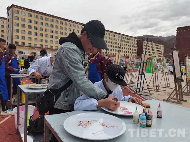 圖為烹飪專業(yè)教師李建國指導來自丁青縣的洛松德青制作果醬畫