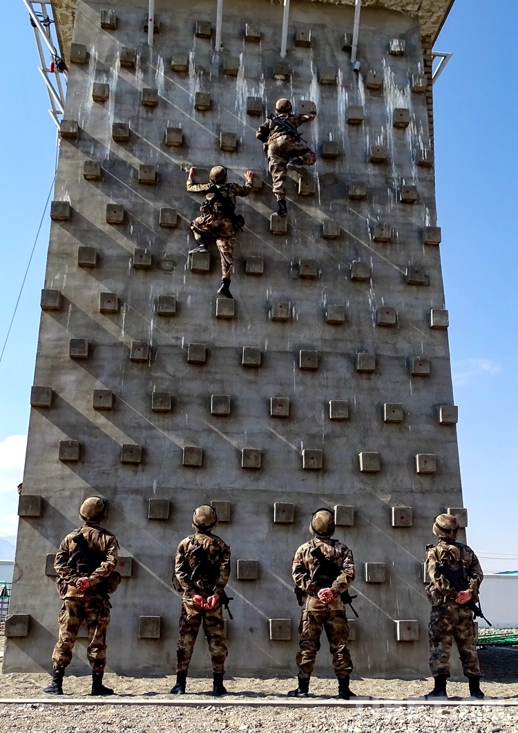 圖為阿里軍分區(qū)某部官兵進(jìn)行攀巖訓(xùn)練