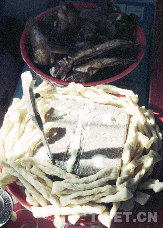 這是插著藏式小刀的藏北美食——“褪”和后面盆裝的手抓羊肉(唐召明1989年攝)