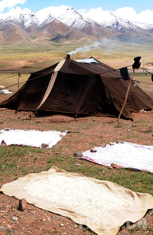 在藏北草原,夏天是牦牛產(chǎn)奶旺季,牧民此時(shí)吃奶類食物比別的季節(jié)多。喝的奶大多是牦牛奶,其次為綿羊奶和山羊奶。人們既喝鮮奶,也喝酸奶、吃奶渣。奶渣大多是拌糌粑時(shí)食用。