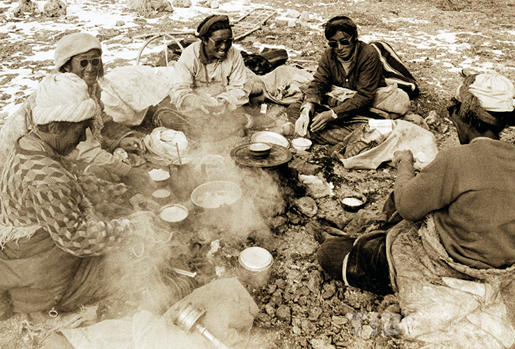這是幾位在班戈縣納木錯(cuò)湖邊煮茶、抓糌粑吃午餐的藏北牧人(唐召明1991年攝)