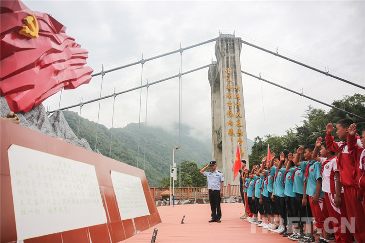 圖為背崩邊境派出所民警在解放大橋愛(ài)國(guó)強(qiáng)邊教育基地為學(xué)生講解“老墨脫精神”