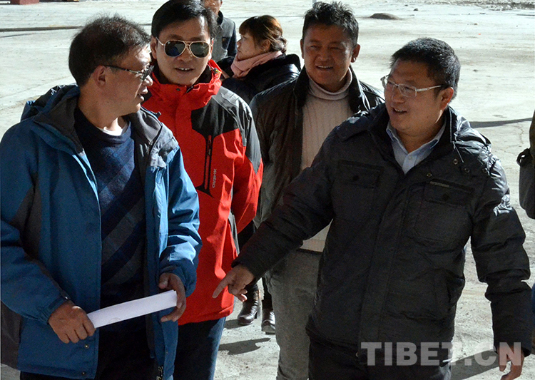 這是中國石化援藏干部王鵬雁(右一)在中國石化小學(xué)二期工程驗收現(xiàn)場同其他縣領(lǐng)導(dǎo)進(jìn)行交流(扎西2014年10月25日攝)