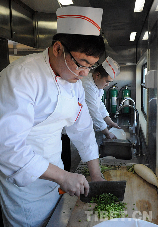 我在北京鐵路客運段京藏列車第二組的餐車里看到,列車在通過唐古拉山區(qū)段時,餐車正在為旅客提供炒菜服務(wù)。我采訪的廚師長孫冠軍告訴我,京藏列車自開通運營以來,除了像西紅柿炒雞蛋因高原沸點低而無法炒成片外,其他三四十種可口飯菜都能在列車運行中的高海拔地段完成。