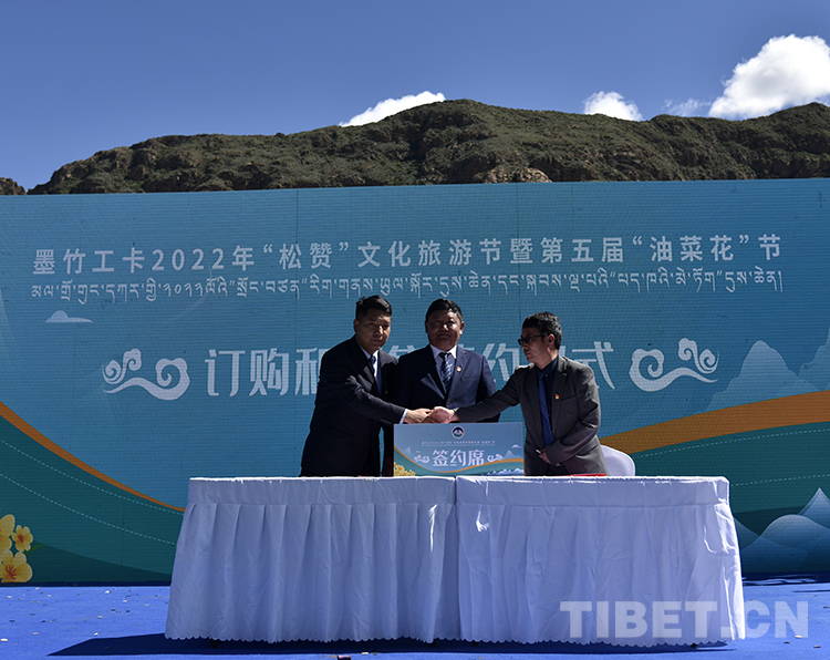 在油菜花田中舉辦的開幕式上,墨竹工卡縣農(nóng)牧業(yè)凈土產(chǎn)業(yè)發(fā)展有限公司代表與唐加鄉(xiāng)、扎西崗鄉(xiāng)分別簽訂認購、預(yù)售合同。在豐收時節(jié),該公司將以高出市場的價格訂單式收購當?shù)剞r(nóng)戶種植的油菜,預(yù)計收購4000噸油菜籽。