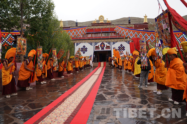 上午12時許,班禪抵達(dá)桑頂寺時,天降甘露、法號齊鳴、嗩吶喧天,桑頂寺僧人組成的儀仗隊在寺廟門口舉行了隆重的歡迎儀式。
