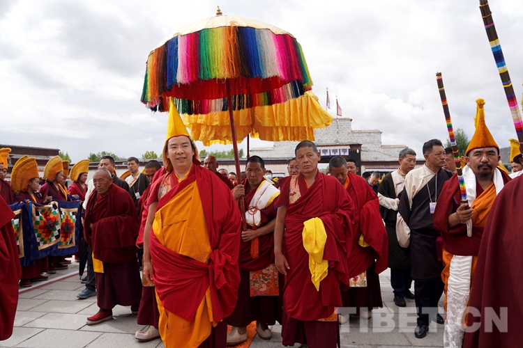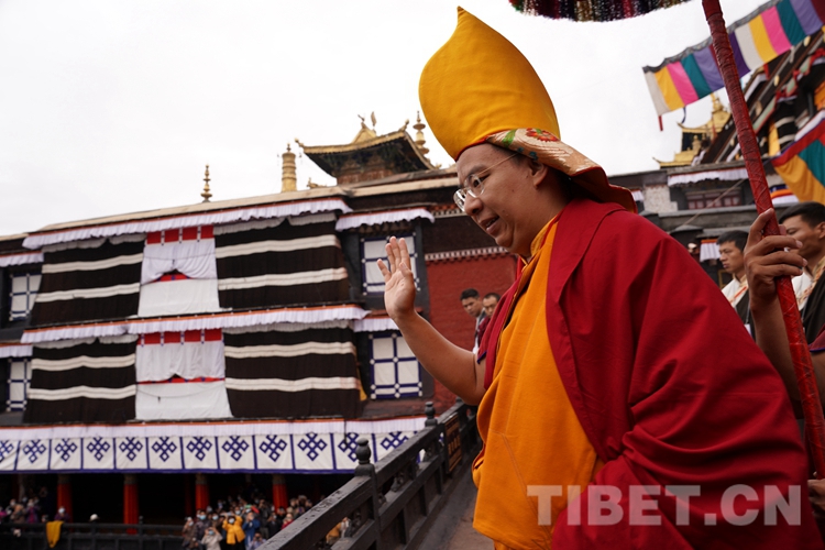 班禪抵達,現(xiàn)場桑煙繚繞,法號聲悠長,扎什倫布寺僧眾以藏傳佛教最高禮儀迎接班禪?,F(xiàn)場等候班禪的信教群眾紛紛摘帽行禮或雙手合十,向班禪的到來表示熱烈歡迎,班禪見狀揮手致意、送上祝福。隨后,班禪在手持黃傘、香爐的高僧引領(lǐng)下緩緩步行至措欽大殿。