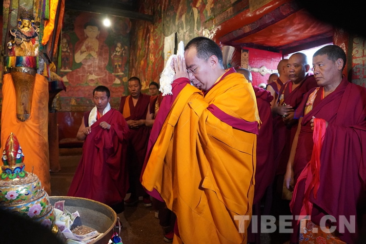 在措欽大殿,班禪虔誠叩拜供奉于此的佛祖釋迦牟尼佛像和藏傳佛教格魯派始祖宗喀巴塑像,與眾僧共同念誦經(jīng)文后,回到寢宮拉讓殿。下午,班禪登上拉讓日光殿寶座,接受扎什倫布寺管委會僧人成員、高僧朝拜,并為他們摸頂賜福,帶領(lǐng)高僧誦經(jīng)祈福。