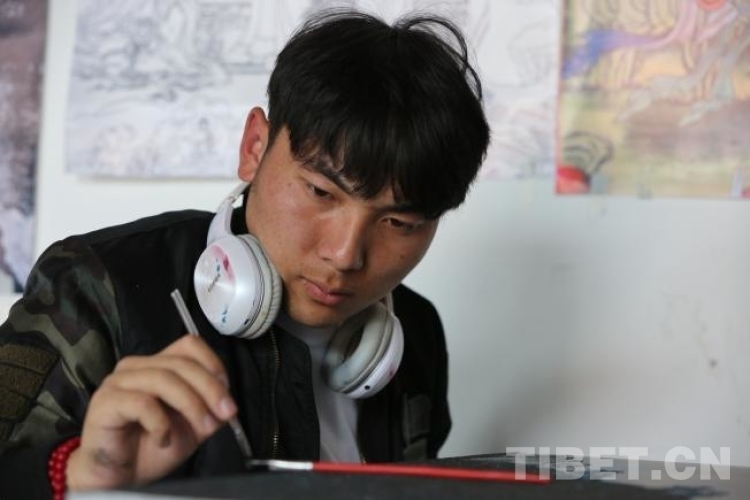 同期學(xué)員中,同樣來(lái)自唐卡世家的白瑪旺青,肩負(fù)家族厚望,被父親委派而來(lái)。2019年,白瑪旺青的父親學(xué)到半途,家中突然接到《格薩爾王與三十大將》的唐卡長(zhǎng)卷訂單,不得不退學(xué)回到江達(dá)縣家中主持繪制工程。這次,他把兒子白瑪旺青、學(xué)徒桑培和尼瑪布派來(lái)學(xué)習(xí),自己帶著46個(gè)學(xué)徒繼續(xù)完成訂制唐卡的繪制?!案赣H對(duì)唐卡漆畫(huà)很支持,要求我們認(rèn)真學(xué),學(xué)成后再傳授給他本人和更多的學(xué)徒,”白瑪旺青說(shuō),“我和父親覺(jué)得,創(chuàng)作漆畫(huà)比傳統(tǒng)唐卡快,也會(huì)贏得新的市場(chǎng),能帶動(dòng)更多學(xué)徒增收。”
