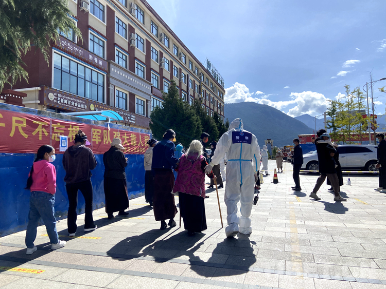 林芝邊境管理支隊輪訓隊民警孫震正攙扶行動不便的老人前往核酸檢測點 攝影:任遠波