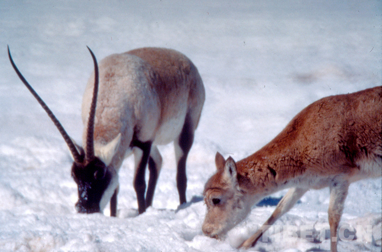 這是一對在羌塘國家級自然保護(hù)區(qū)雪地里覓食的國家一級保護(hù)動物藏羚羊(唐召明提供,2007年6月21日攝)
