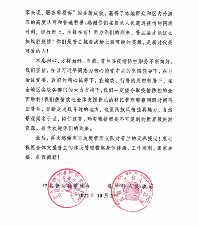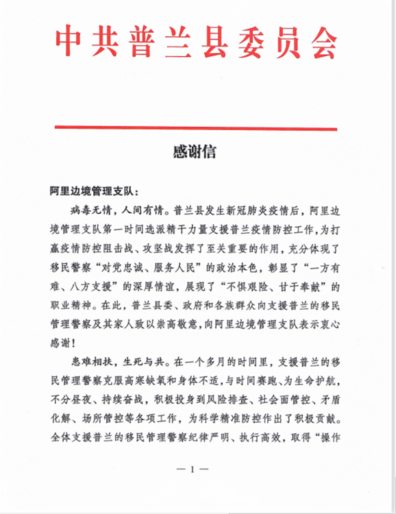 中國(guó)西藏網(wǎng)訊 “普蘭縣發(fā)生新冠肺炎疫情后,阿里邊境管理支隊(duì)第一時(shí)間選派精干力量支援普蘭疫情防控工作,為打贏疫情防控阻擊戰(zhàn)、攻堅(jiān)戰(zhàn)發(fā)揮了至關(guān)重要的作用?!?0月2日,西藏自治區(qū)阿里邊境管理支隊(duì)收到一封來(lái)自阿里地區(qū)普蘭縣委的感謝信。信中對(duì)阿里邊境管理支隊(duì)?wèi)?zhàn)“疫”一線(xiàn)民警在一個(gè)多月的疫情防控工作中,克服困難、勇于擔(dān)當(dāng)、不分晝夜、持續(xù)奮戰(zhàn)的抗疫工作表達(dá)了感謝,給予了肯定。