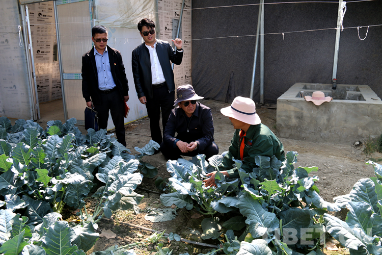 圖為次仁頓珠(左邊第三個(gè)戴灰色太陽(yáng)帽為次仁頓珠)深入基層了解老百姓溫室菜棚經(jīng)營(yíng)情況