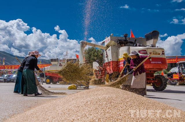 圖為2019年9月6日,2019?西藏“中國農(nóng)民豐收節(jié)”暨扎囊縣氆氌文化節(jié)期間,西藏自治區(qū)山南市扎囊縣羊噶居委會機(jī)械化打麥現(xiàn)場 攝影:趙耀
