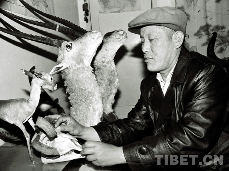 這是洛桑丹珍在他的家庭博物館里整理所收藏的動(dòng)物標(biāo)本(唐召明1998年攝)