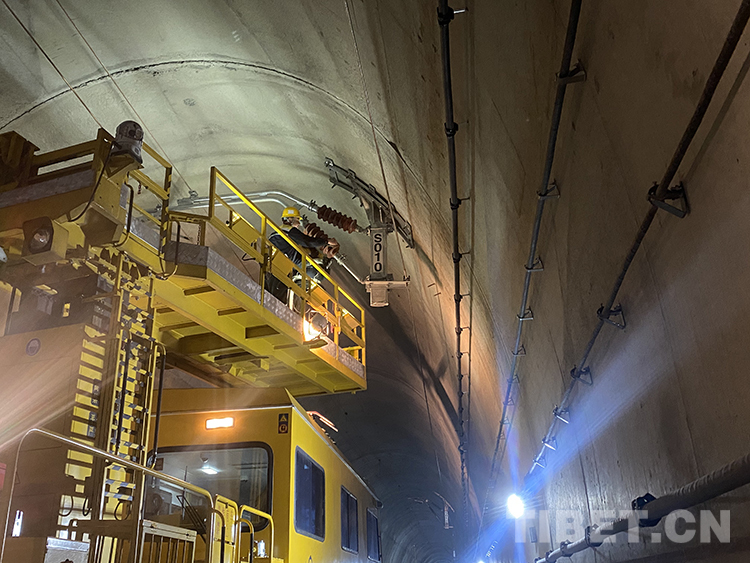中國西藏網(wǎng)訊 初冬時節(jié),雅魯藏布江畔,秋葉繽紛、層林盡染。在穿山過江的拉林鐵路桑珠嶺隧道內(nèi)機器轟鳴、人聲鼎沸。11月14日10時25分,中國鐵路青藏集團有限公司拉薩基礎(chǔ)設施段桑日綜合維修車間的接觸網(wǎng)工陳世召頭戴安全帽、身穿防雨服、腳踩絕緣靴,手中的高壓水槍迸射出道道白色弧線。