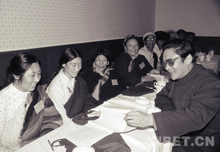 這是時(shí)任西藏自治區(qū)黨委副書記熱地(右)在與人大代表進(jìn)行交流。1988年1月15日至23日,西藏自治區(qū)第四屆人民代表大會第六次會議在拉薩召開(唐召明1988年攝)