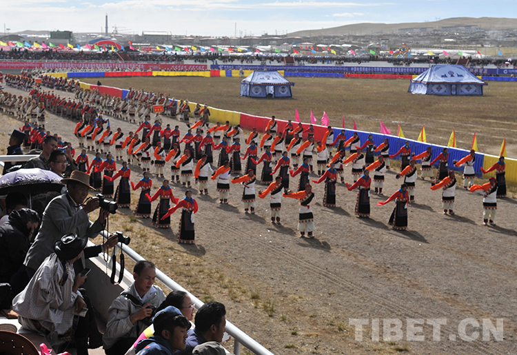 這是來自那曲地區(qū)(現(xiàn)那曲市)各縣代表隊在進行入場式表演。當(dāng)日,那曲賽馬藝術(shù)節(jié)在藏北首府那曲鎮(zhèn)開幕(唐召明2013年8月10日攝)