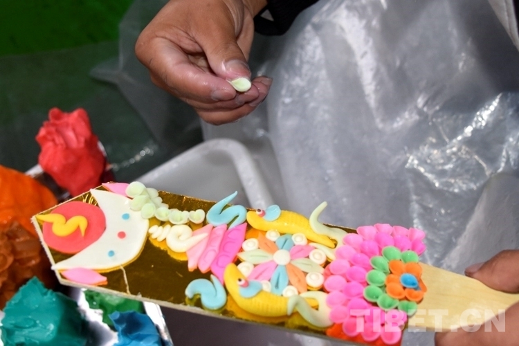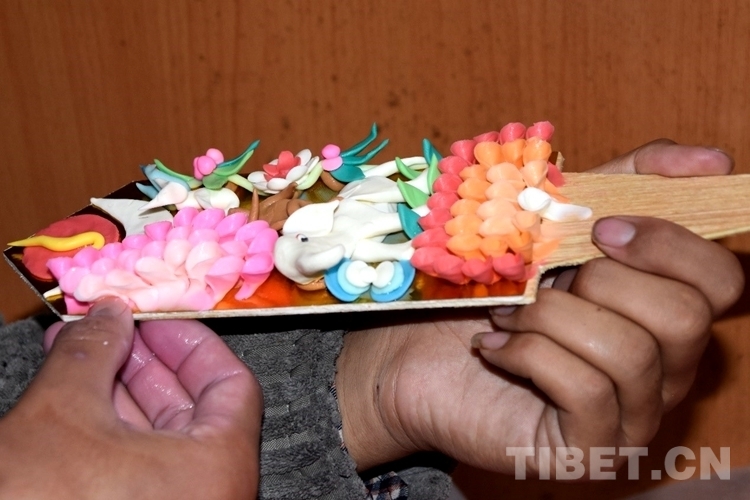 酥油花是藏民族雕塑藝術(shù)的一種特殊形式,它是以人物、花卉、樹木、飛禽、走獸等為主題的一種手工油塑藝術(shù),具有悠久的歷史。藏歷新年期間,西藏群眾會(huì)在切瑪盒的左右兩邊分別裝滿糌粑和炒青稞,然后在上面插上象征五谷豐登的“羅薩美朵”(彩色青稞穗)和寓意吉祥的酥油花。(中國西藏網(wǎng) 記者/次旦拉姆)