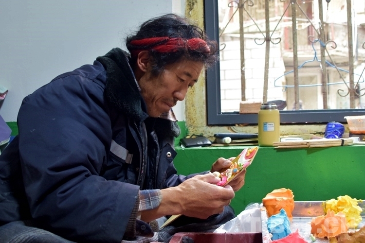 “我們一般在藏歷新年前20天左右到達(dá)拉薩。買酥油,和礦物染色原料調(diào)至成泥狀后便開始捏制?!钡┰稣f,普松鄉(xiāng)有制作酥油花的傳統(tǒng),每年藏歷新年臨近,他們便結(jié)伴來到拉薩制作酥油花銷售。