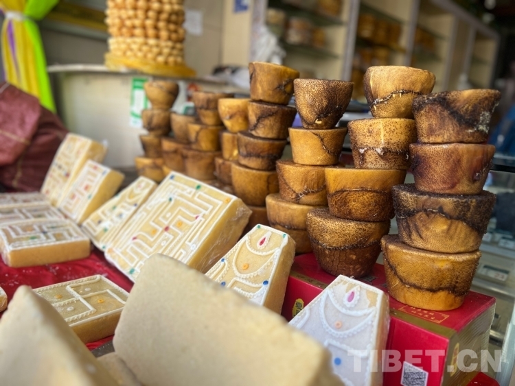 圖為藏歷新年年貨市場里的“退”(奶渣糕)和酥油 攝影:德吉卓瑪