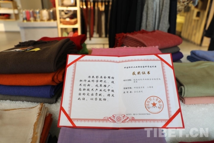 牦牛的生存環(huán)境決定了牦牛絨比普通羊毛更加保暖、柔軟,但也帶來了紡織上的技術(shù)難題。牦牛絨很細,纖維的卷曲較少并且卷曲形態(tài)不規(guī)則,成條成紗難度大。在不斷的探索中,團隊發(fā)現(xiàn)牦牛絨與蠶絲混紡能改善牦牛絨的可紡性,這解決了一大技術(shù)難題,公司還因此獲得知識產(chǎn)權(quán)專利及多項科學技術(shù)獎項。