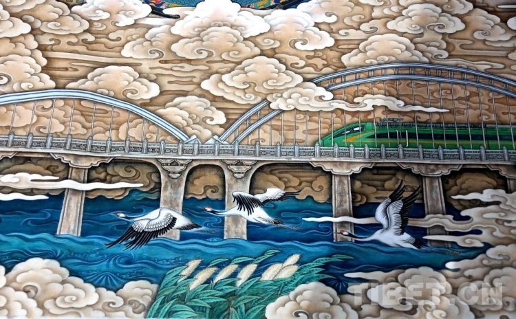 據(jù)介紹,自西藏和平解放以來,在黨和國家的政策扶持下,西藏的唐卡藝術(shù)得到了很好的傳承和發(fā)展,傳統(tǒng)唐卡的五大畫派在各自的創(chuàng)作領(lǐng)域都有很高的藝術(shù)成就,但是傳統(tǒng)唐卡的各大畫派集中創(chuàng)作的形式從未有過,用傳統(tǒng)唐卡描繪新西藏的盛世圖景更是空白。迫切地需要西藏本土的美術(shù)工作者擔(dān)起文化使命感,用民族美術(shù)的載體歌頌偉大的中華民族、歌頌我們所處的美好時代、歌頌來之不易的美好生活。大型唐卡壁畫《高原明珠》應(yīng)運而生。