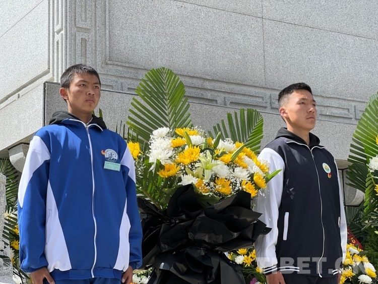 圖為拉薩那曲第一高級中學(xué)學(xué)生代表向革命先烈敬獻(xiàn)花籃 攝影:德吉卓瑪