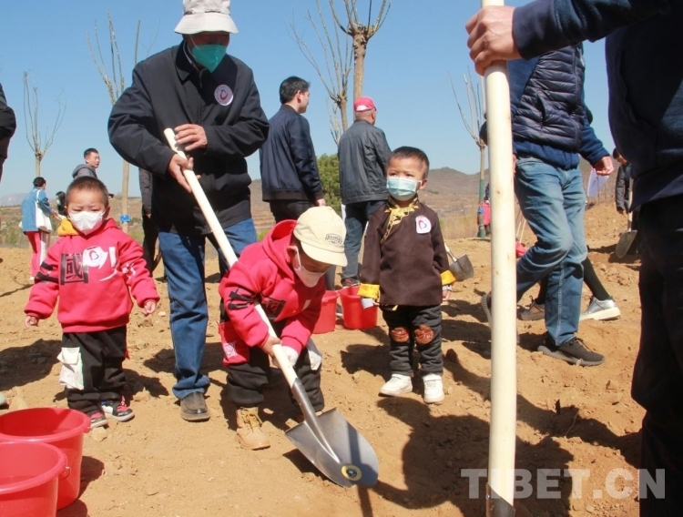 來(lái)自青海省果洛藏族自治州的多杰雖然才3歲多,但在掌握了鐵锨的使用后,他就成了整個(gè)植樹(shù)區(qū)域的熱心人,到處幫助別人鏟土,樂(lè)此不疲。圖為多杰正在幫助別人鏟土植樹(shù) 攝影:劉莉