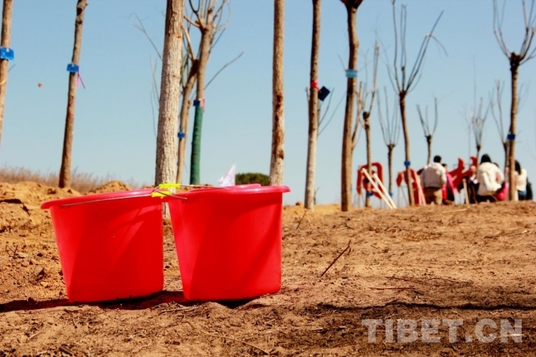 圖為來(lái)自青海省果洛藏族自治州的多杰奮力揮動(dòng)鐵锨與大家一起植樹(shù) 攝影:劉莉