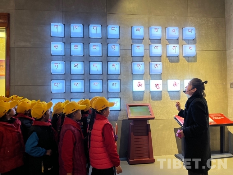走進“藏地智慧”,學生們一眼認出藏文創(chuàng)始人吞彌·桑布扎,大家異口同聲回答講解員的問題說:“這是吞彌·桑布扎?!钡玫街v解員的肯定、并向他們講述背后的相關(guān)歷史后,學生們聽得很入迷,也更有信心面對接下來的問題。藏文的信息化使得這一古老文字煥發(fā)著全新而旺盛的生命力,在這里學生們欣賞藏文在智能手機、電腦、多功能點讀機等智能電子設(shè)備內(nèi)“走動”、傳統(tǒng)農(nóng)牧業(yè)的模擬場景和現(xiàn)代化的機械設(shè)備圖、藏醫(yī)藥材、藏香藏紙制造和制鹽過程等獨具特色的藏族傳統(tǒng)手工藝,也能很好的回答講解員提出的問題,現(xiàn)場互動氣氛熱烈?!斑@種活動我們學校不會常有,當孩子們聽到要去拉薩時像是要過年那樣高興,一路上問這問那地充滿好奇?!倍喟奏l(xiāng)小學的帶隊老師羅珍介紹:“這次參加活動的這些學生都是三、四、五年級的學生,個個品學兼優(yōu)。”
