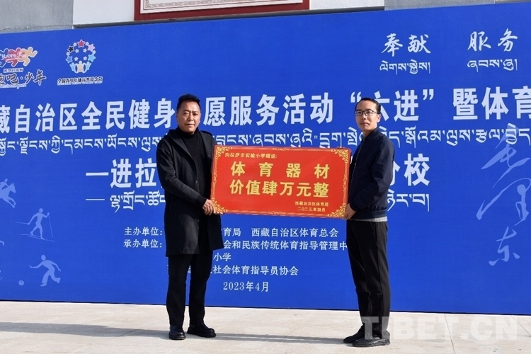 活動(dòng)開(kāi)幕式現(xiàn)場(chǎng),西藏自治區(qū)體育局社體中心向拉薩市實(shí)驗(yàn)小學(xué)東城分校,配發(fā)了價(jià)值四萬(wàn)元整的校園體育器材,保障學(xué)生日常體育運(yùn)動(dòng)需要。
