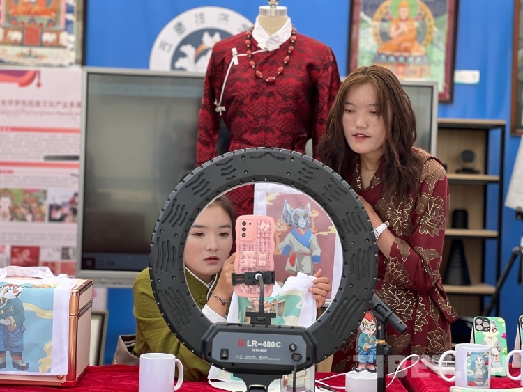 在展示交流區(qū),兩名穿著藏裝的姑娘正在通過直播向觀眾介紹有十二生肖圖案的被子、手機殼、筆記本等各類產(chǎn)品,也吸引著現(xiàn)場嘉賓前來參觀。“這些作品是民族文化產(chǎn)業(yè)系學(xué)生的作品,圖案都是學(xué)生自己繪畫的原創(chuàng)文創(chuàng)產(chǎn)品?!蔽鞑丶紟煂W(xué)院數(shù)字信息產(chǎn)業(yè)系教師桑珍介紹,“兩位姑娘是21級電商專業(yè)學(xué)生,通過這次活動一方面希望自己得到鍛煉,另一方面也是為7月份的電商大賽做前期的培訓(xùn)。”