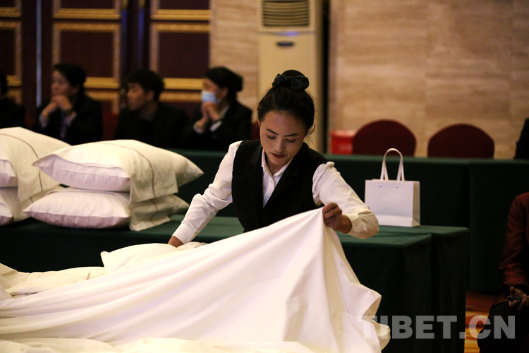 中國西藏網(wǎng)訊 5月11日,由西藏自治區(qū)旅游發(fā)展廳、西藏自治區(qū)總工會、共青團(tuán)西藏自治區(qū)委員會、西藏自治區(qū)婦女聯(lián)合會主辦,西藏旅游飯店業(yè)協(xié)會承辦的2023年西藏自治區(qū)星級飯店從業(yè)人員服務(wù)技能競賽在拉薩開賽。45名選手圍繞中餐宴會擺臺、西餐宴會擺臺、中式鋪床及夜床服務(wù)、前廳服務(wù)4個項(xiàng)目同臺競技。