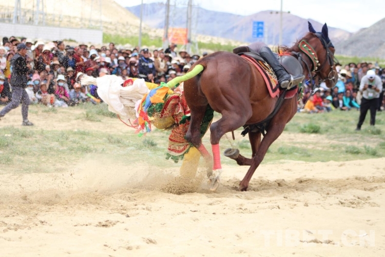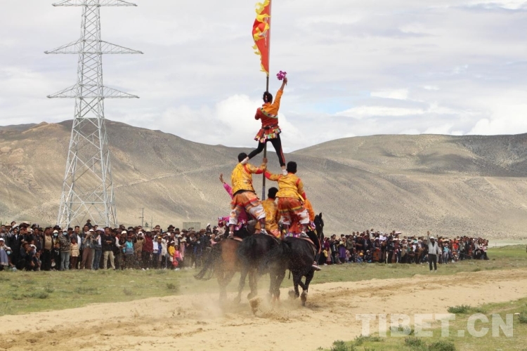 賽馬運(yùn)動是藏族群眾十分喜愛的傳統(tǒng)體育運(yùn)動之一,對于藏族人而言,參加賽馬和觀看賽馬能帶來好運(yùn)。下午,來自西藏自治區(qū)馬術(shù)團(tuán)的選手們通過單人單馬、馬上射箭、馬上拾哈達(dá)、馬上敬酒、馬上仰背、多人多馬等表演,呈現(xiàn)了一場激動人心的馬術(shù)表演。表演期間當(dāng)選手們做出高難度的動作時現(xiàn)場觀眾神情緊張,當(dāng)選手們順利完成表演時,現(xiàn)場高聲叫好、掌聲連連。