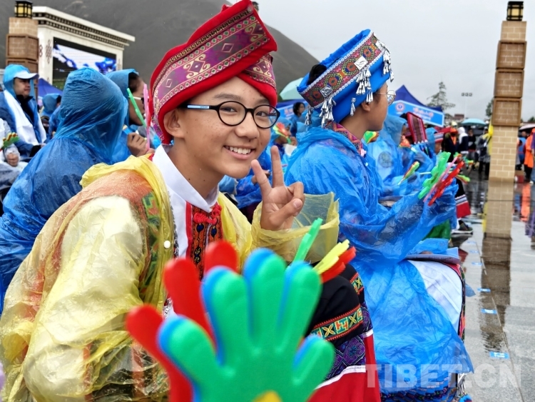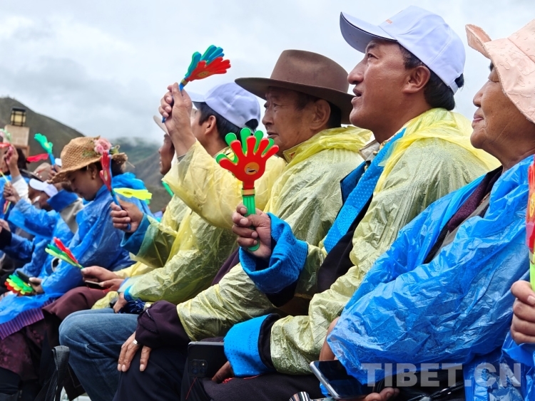 當天上午,雨水時急時緩下著。當?shù)孛癖姄沃鴤?、披著雨衣早早落座等待演出開始。白瑪次仁是附近的村民,他告訴記者:“我平時就喜歡唱歌和跳舞,所以收到有文藝演出的通知就早早過來觀看,畢竟平時很少看到如此大型的演出?!?/span>