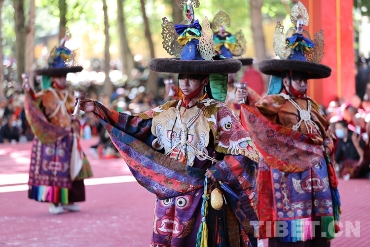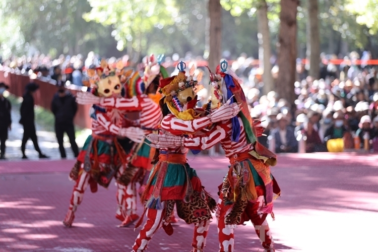 當(dāng)渾厚悠遠(yuǎn)的法號(hào)、法螺聲在大院內(nèi)外回旋開來,“羌姆”表演正式拉開帷幕。期間,僧人頭戴面具,身穿戲裝,手持鼓刀斧等道具,逐次表演金剛、骷髏、鹿牛、比丘、鴉鴟、六長壽等數(shù)十節(jié)神舞,氣氛莊重而神秘。