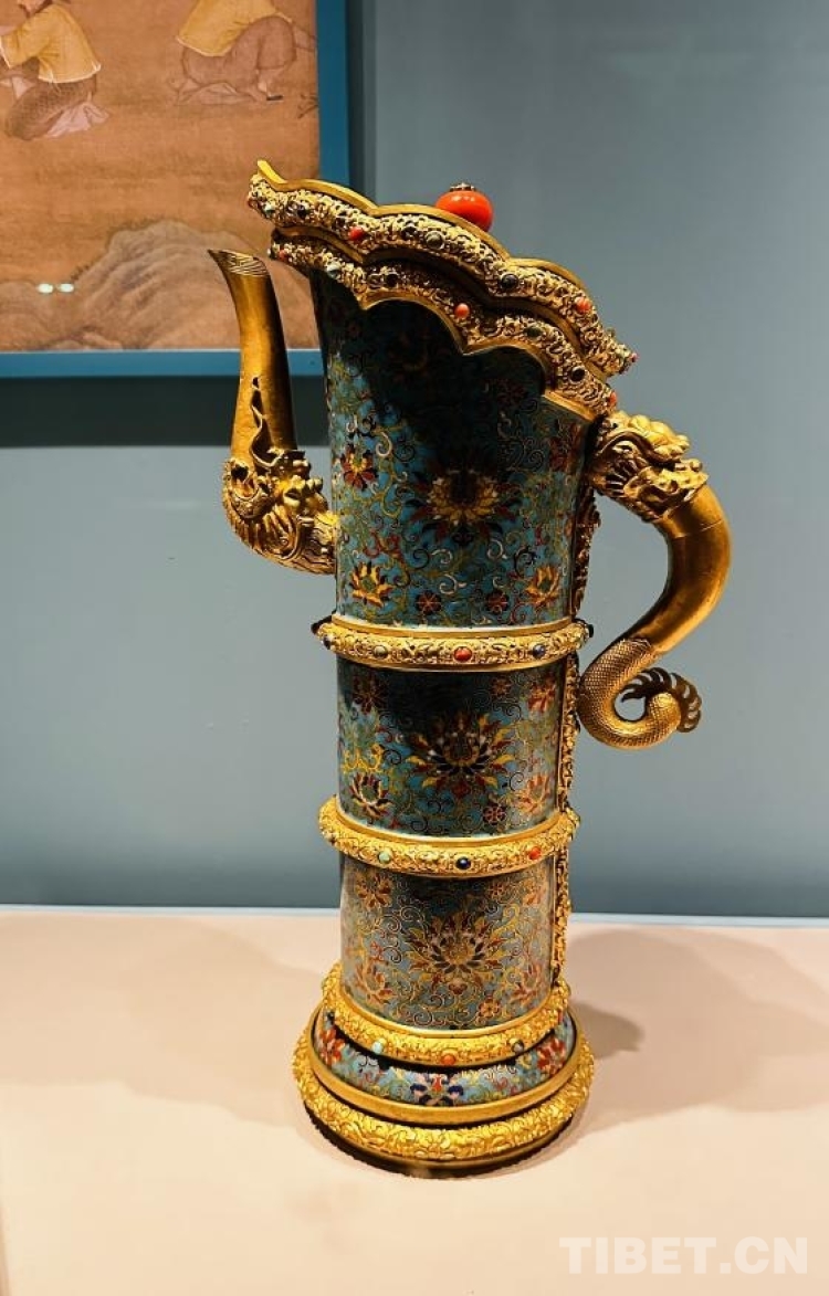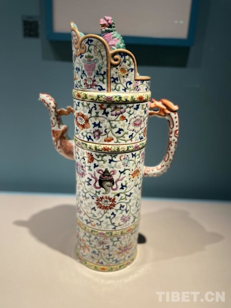 多穆壺是蒙、藏、滿等民族盛裝奶茶或熬制酥油茶的器皿,多穆為藏語發(fā)音,即奶茶壺之意。其形制各異、材質(zhì)有別,功用亦不相同。自康熙時期開始,清宮便制作有木質(zhì)、琺瑯、漆器、瓷器等各種材質(zhì)的多穆壺。故宮博物院收藏的粉彩八吉祥纏枝蓮紋多穆壺、銅胎掐絲琺瑯勾蓮紋多穆壺、紫漆描金纏枝蓮紋皮胎多穆壺等。精美的器具和醇香的奶茶一道構(gòu)成了清代宮廷獨特的奶茶文化。