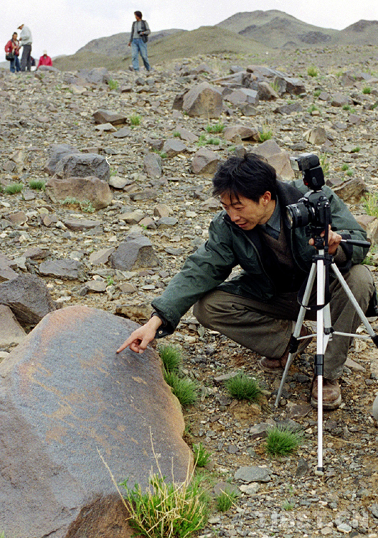藏北高原無(wú)人區(qū)科考團(tuán)人員在對(duì)尼瑪縣榮瑪鄉(xiāng)加林山巖畫(huà)進(jìn)行科考(唐召明2001年攝)