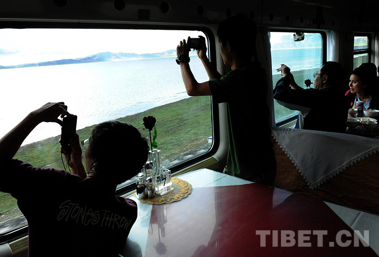 “天路”列車(chē)在通過(guò)錯(cuò)那湖時(shí),旅客們紛紛用手機(jī)拍攝美景(唐召明2012年8月12日攝)