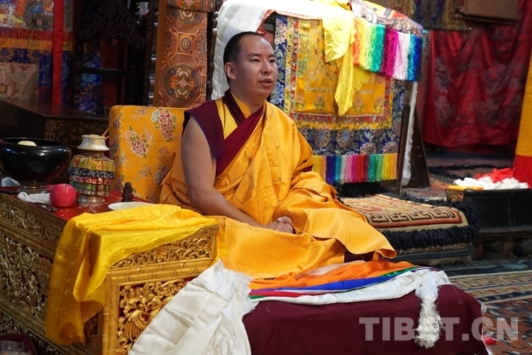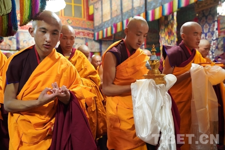 當(dāng)天清晨,扎什倫布寺桑煙繚繞、法號(hào)聲聲,28 位受戒的年輕僧人帶著新制袈裟,迎著朝霞依次走向拉讓殿等待班禪授戒這一神圣時(shí)刻的到來。8時(shí)許,在手持黃傘、香爐和吹嗩吶的高僧護(hù)送引領(lǐng)下班禪緩緩步入拉讓殿,并與在場(chǎng)僧眾集體誦經(jīng)。誦經(jīng)儀式結(jié)束后,班禪就坐于拉讓殿寶座,4名高僧大德作為授戒眾,開始為僧人閉門授戒、剃度、賜法名、摸頂。此時(shí),受戒僧人一一入座,兩手在胸前交叉,聽班禪引證經(jīng)典告誡,并宣誓嚴(yán)守戒律。