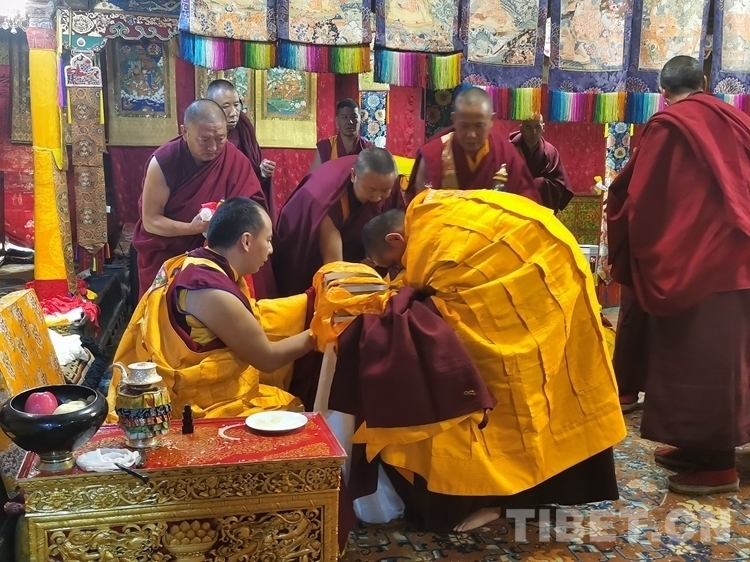 中國(guó)西藏網(wǎng)訊 11月4日,即藏歷九月二十二日是藏傳佛教傳統(tǒng)的“降神節(jié)”,降神節(jié)藏語稱“拉波堆慶”。在這特殊的日子里,全國(guó)政協(xié)常委、中國(guó)佛教協(xié)會(huì)副會(huì)長(zhǎng)、中國(guó)佛協(xié)西藏分會(huì)會(huì)長(zhǎng)班禪額爾德尼·確吉杰布,為日喀則市江孜縣重孜寺生欽·旦巴熱杰活佛授予比丘戒暨為扎什倫布寺部分年輕僧人傳授沙彌戒儀式在扎什倫布寺拉讓殿舉行。