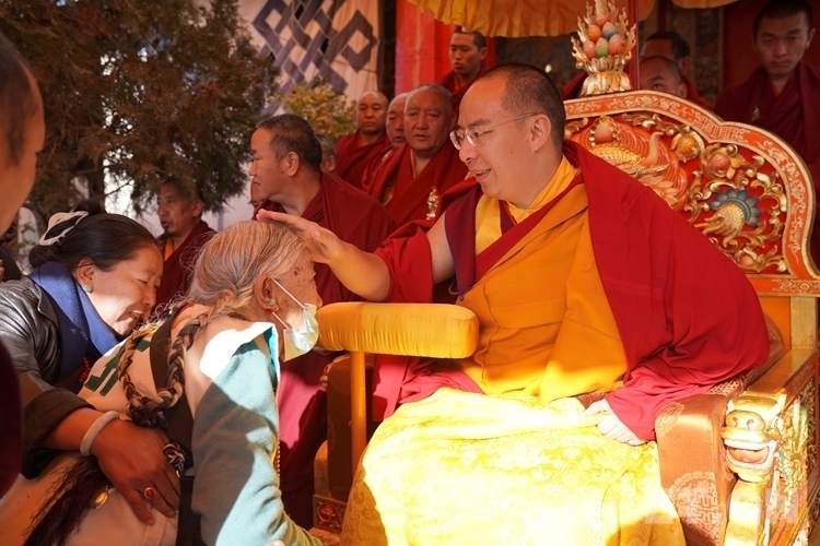 日喀則市桑珠孜區(qū)的索朗頓珠來到班禪面前,雙手合十將手持轉(zhuǎn)經(jīng)筒高高舉起,班禪見狀為其摸頂賜福,并為其轉(zhuǎn)經(jīng)筒開光加持?!艾F(xiàn)在生活美滿,今天又得到班禪仁波切的摸頂賜福和加持,感覺特別幸福。”索朗頓珠搖動著轉(zhuǎn)經(jīng)筒,戀戀不舍地回頭矚望。